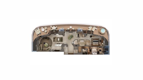 Met 280 m² behoort de Owner’s Residence tot de ruimste privéverblijven op zee. De kamerhoge ramen bieden een panoramisch uitzicht van 180 graden en versterken het open karakter van de suite. Het buitenterras strekt zich uit over de volledige breedte en biedt plaats voor loungen, dineren en ontspannen in de privé‑whirlpool. De inrichting is ontwikkeld met aandacht voor tactiliteit en ingetogen luxe, geïnspireerd door mediterrane materialen en een hedendaagse vormentaal.