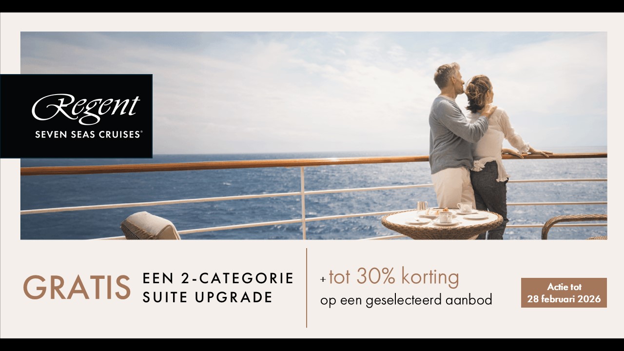 Richt jouw blik op de horizon en laat jouw klanten genieten van de 'GRATIS 2 categorieën suite upgrade', plus tot 30% korting op geselecteerde cruises in 2026.