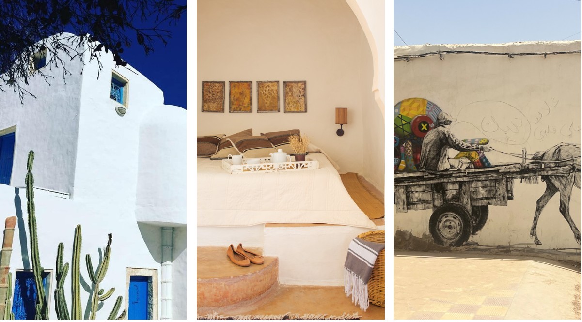 | 2. Djerbahood, het street art dorp van de Middellandse Zee In het dorp Erriadh op Djerba vind je een van de meest onverwachte kunstprojecten van Noord-Afrika. Djerbahood ontstond toen 150 internationale street art kunstenaars meer dan 250 murals creëerden op de witte huisjes van het dorp. Het resultaat is een kleurrijk openluchtmuseum dat Djerba een creatieve en eigentijdse uitstraling geeft. Er zijn enkele charmante hotels in de buurt, perfect om te leven tussen de locals : - Dar Dhiafa: artistiek boutiquehotel in traditionele stijl met eigen restaurant en cocktailbar