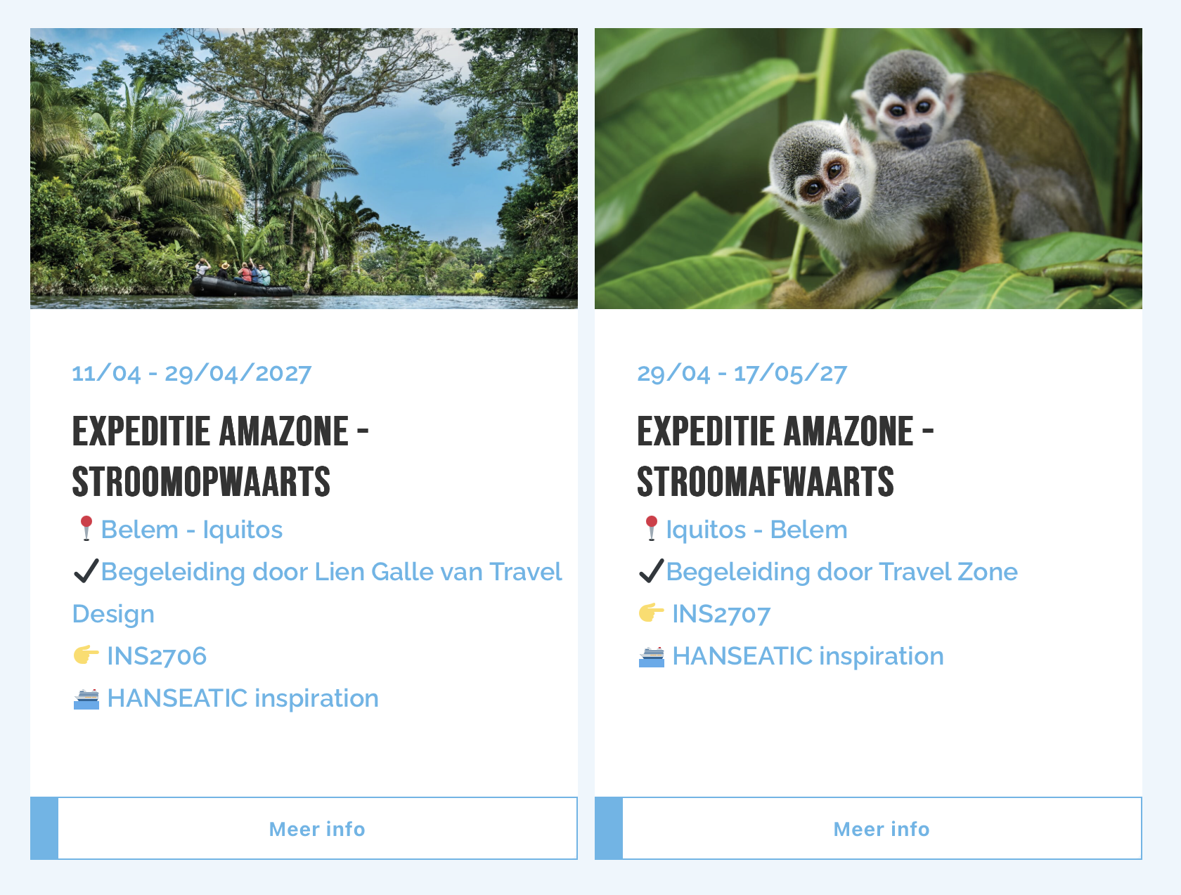 - Expeditiebestemmingen waar alleen kleine schepen kunnen komen. Zodiactochten over smalle zijrivieren, diep de natuur in.